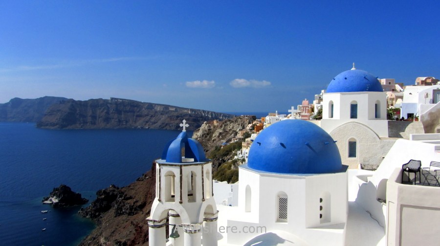 Su nombre real es Thera, pero todo el mundo la conoce por el que proviene del italiano «Santa Irene». En realidad un archipiélago compuesto por varias islas, no es más que el borde superior de la antigua caldera de un volcán, de ahí su forma más o menos circular, que explotó en el año 1628 o 27 a.c., cuando la isla ya estaba habitada. El maremoto que originó se considera responsable de la desaparición de la civilización minoica de Creta. Sigue siendo una región con actividad volcánica, con su última erupción en 1950.